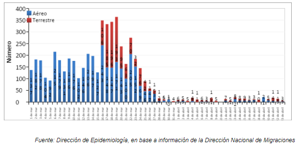 Hasta el día 24 de abril se registraron 5249 ingresos: 3986 por vía aérea (desde el 1 de marzo) y 1263 por vía terrestre (desde el 16 de marzo).